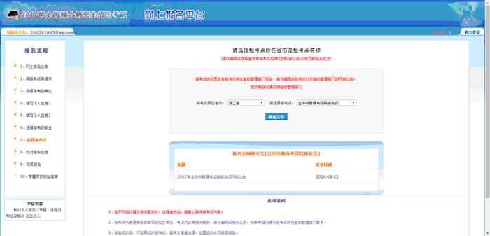 8.点击下一步选择报考点所在省市及报考点名称(报考点选择是涉及之后的报名缴费、考试地点等)